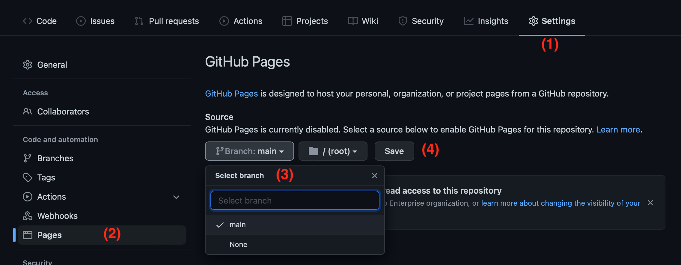 settings del repositorio.pages dentro de settings del repositorio.main y la carpeta root del repositorio.save para guardar los cambios.